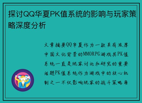 文章摘要:QQ华夏作为一款具有浓厚中国文化背景的MMORPG游戏,其PK值系统一直是玩家讨论和研究的重要话题。PK值系统作为游戏中的核心机制之一,不仅影响玩家的战斗策略、角色发展,还对玩家社交关系、职业选择等方面产生深远影响。本文将从PK值对玩家策略、角色选择、社交互动、以及游戏平衡性的影响等多个角度进行详细分析,并通过实际案例探讨该系统如何塑造玩家的行为与游戏体验。通过这篇文章的探讨,旨在为玩家提供更深层次的理解,帮助其制定更加合理的游戏策略,提升游戏乐趣。